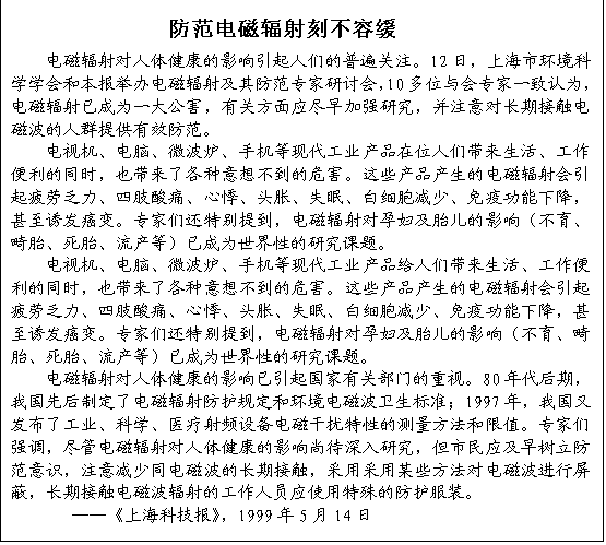 在您看電視的時(shí)候,您也許不會(huì)料到比高壓電纜所產(chǎn)生的電磁波還要強(qiáng)的電磁輻射正籠罩著您;在您用移動(dòng)電話談妥一宗生意的時(shí)候,您不會(huì)想到手機(jī)天線集中釋放的電磁波已經(jīng)進(jìn)入了您的體內(nèi)……